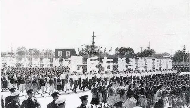 左:支持反右运动的游行---把反右运动进行到底!右:群众正在批判中国头号右派章伯钧。